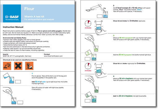 Gestaltung der grafischen Elemente und Piktogramme eines Test Kits der BASF in Zusammenarbeit mit der GIZ (Deutsche Gesellschaft für Internationale Zusammenarbeit) und dem BMZ (Bundesministerium für wirtschaftliche Zusammenarbeit und Entwicklung) zur semiquantitativen Vitamin A-Analyse in Öl, Zucker und Mehl. Im Rahmen eines internationalen Projekts der BASF Micronutrient Initiatives zur Reduzierung von Mangelernährung in der 3. Welt. Zum Test Kit gehören jeweils eine Tasche, die Versuchsutensilien, eine Analysetafel, eine Faxrückantwort und eine Gebrauchsanweisung - hier exemplarisch das Mehl Kit (weiterhin wurden ein Set für Öl und Zucker umgesetzt).